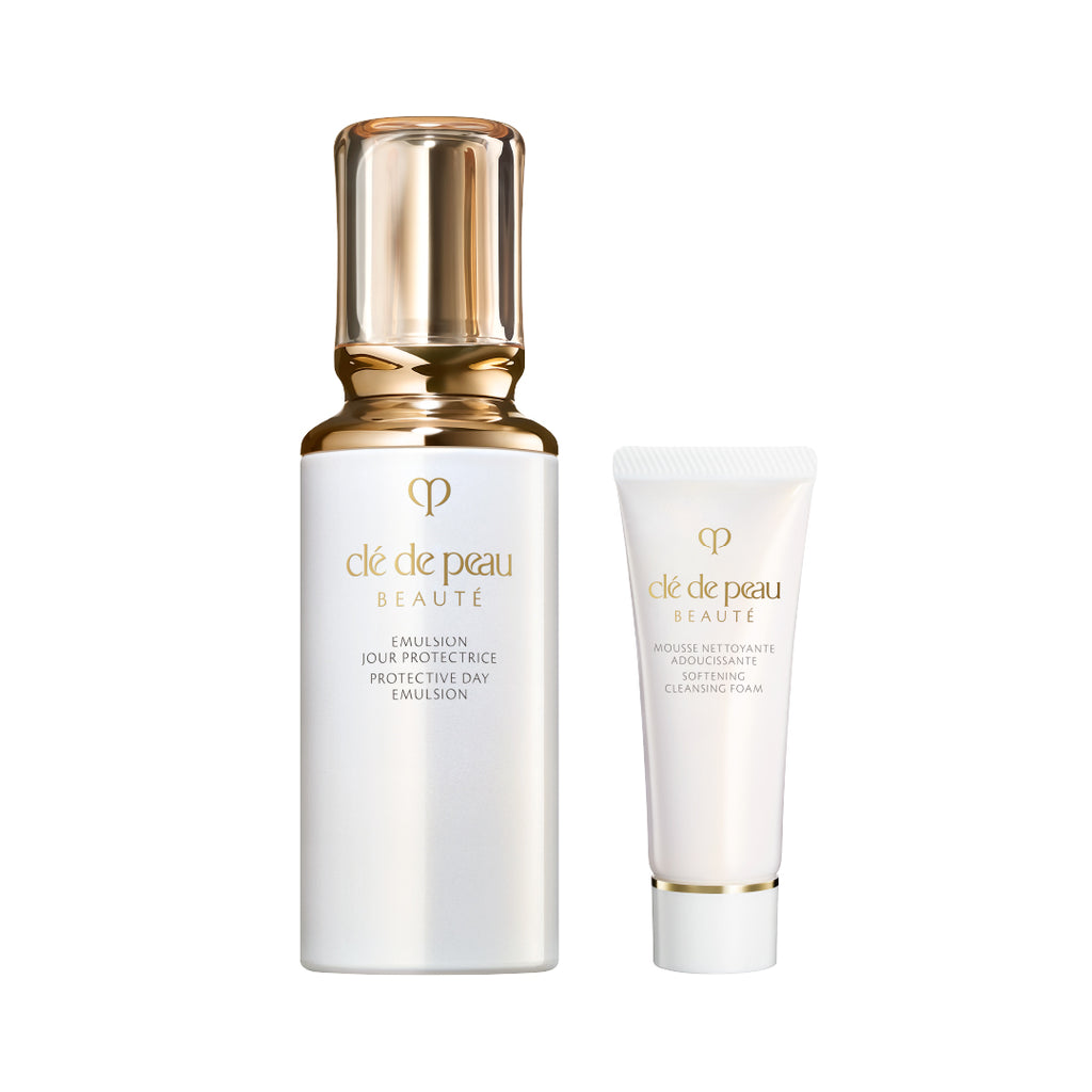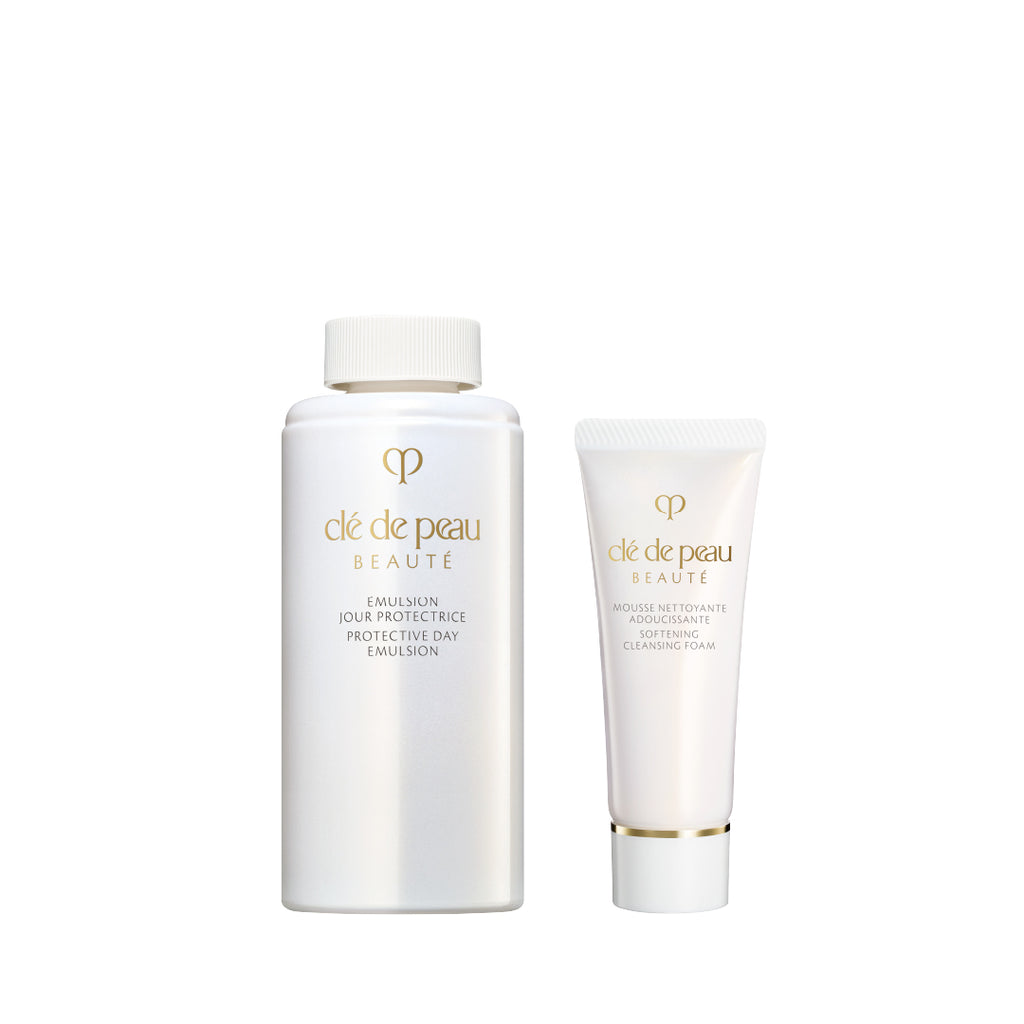 輝き続ける肌のために。朝の肌に必要なうるおいが長時間続く日中用の乳液と、しっとりとした肌に洗い上げる洗顔の特製サイズのキット